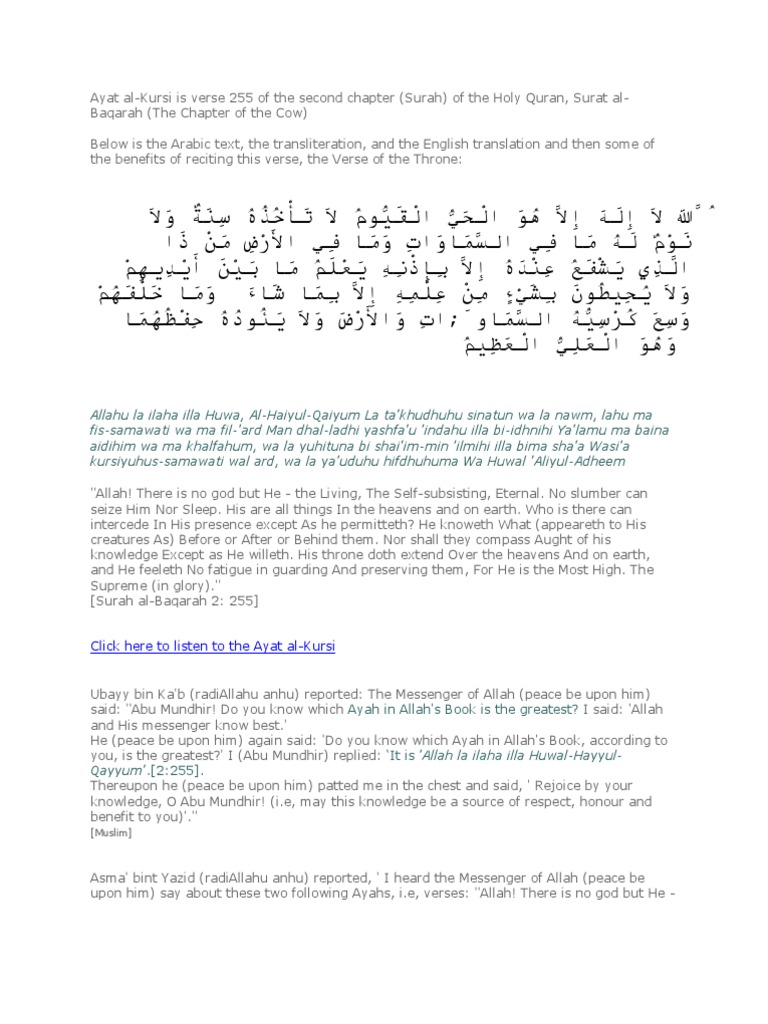 Ayat ul kursi a'uzu billahi minashaitanir rajim i seek refuge in allah from the outcast satan this is an assurance for true believers that their permanence is in adherence to the living god rather than relying on any worldly means in dire circumstances. It is called the throne of the quran, which is memorized nearly by most of the muslims. We are glad that allah subhan wa ta'ala had given us this opportunity to write about the holy quran. In the name of allah, the most beneficent and merciful. Your browser does not support the audio element.